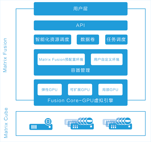 Supporting a wide range of hardware and operating systems, Matrix Fusion provides an end-to-end infrastructure software solution that manages the underlying CPU and GPU computing resources and automates workload provisioning. Deep learning is a typical application that uses both CPU and GPU to handle workloads. Matrix Fusion becomes a CPU+GPU resource pool by integrating all the user's hardware resources (cluster or stand-alone), and then reallocating the CPU and GPU according to the developer's needs. In a developer's virtual environment, administrators can also flexibly allocate redundant computing resources to other users or to more demanding workloads.