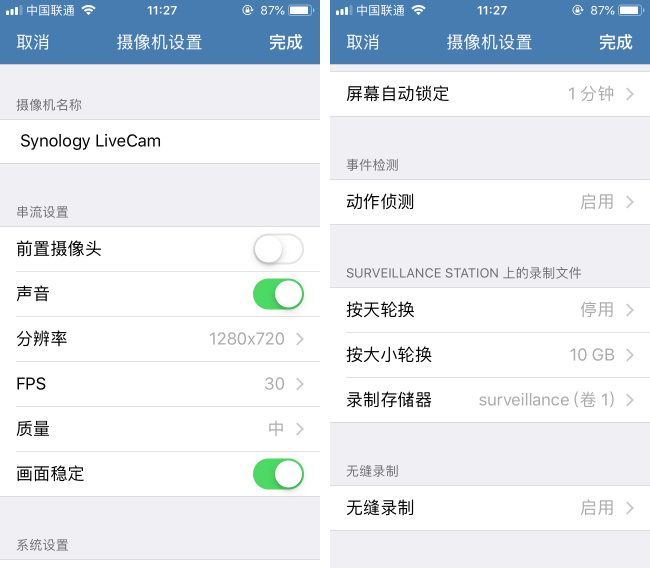 當(dāng)然你可以對(duì)監(jiān)控用的手機(jī)進(jìn)行一番設(shè)置,通過進(jìn)階設(shè)置你可以對(duì)錄像質(zhì)量進(jìn)行進(jìn)一步的設(shè)置(分辨率、幀數(shù)、質(zhì)量以及使用的攝像頭等),同時(shí)你還可以設(shè)置報(bào)警規(guī)則(動(dòng)作監(jiān)控報(bào)警)并且自定義錄像在 NAS 上的保留天數(shù)以及是否無(wú)縫錄制——即便是遇到斷網(wǎng),也可以先將錄制視頻保存在手機(jī)上,然后在有網(wǎng)絡(luò)的情況下上傳到 NAS 上。